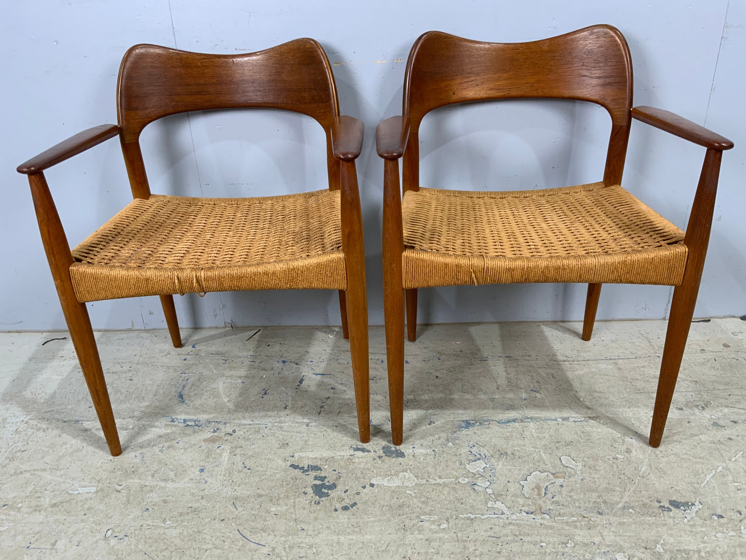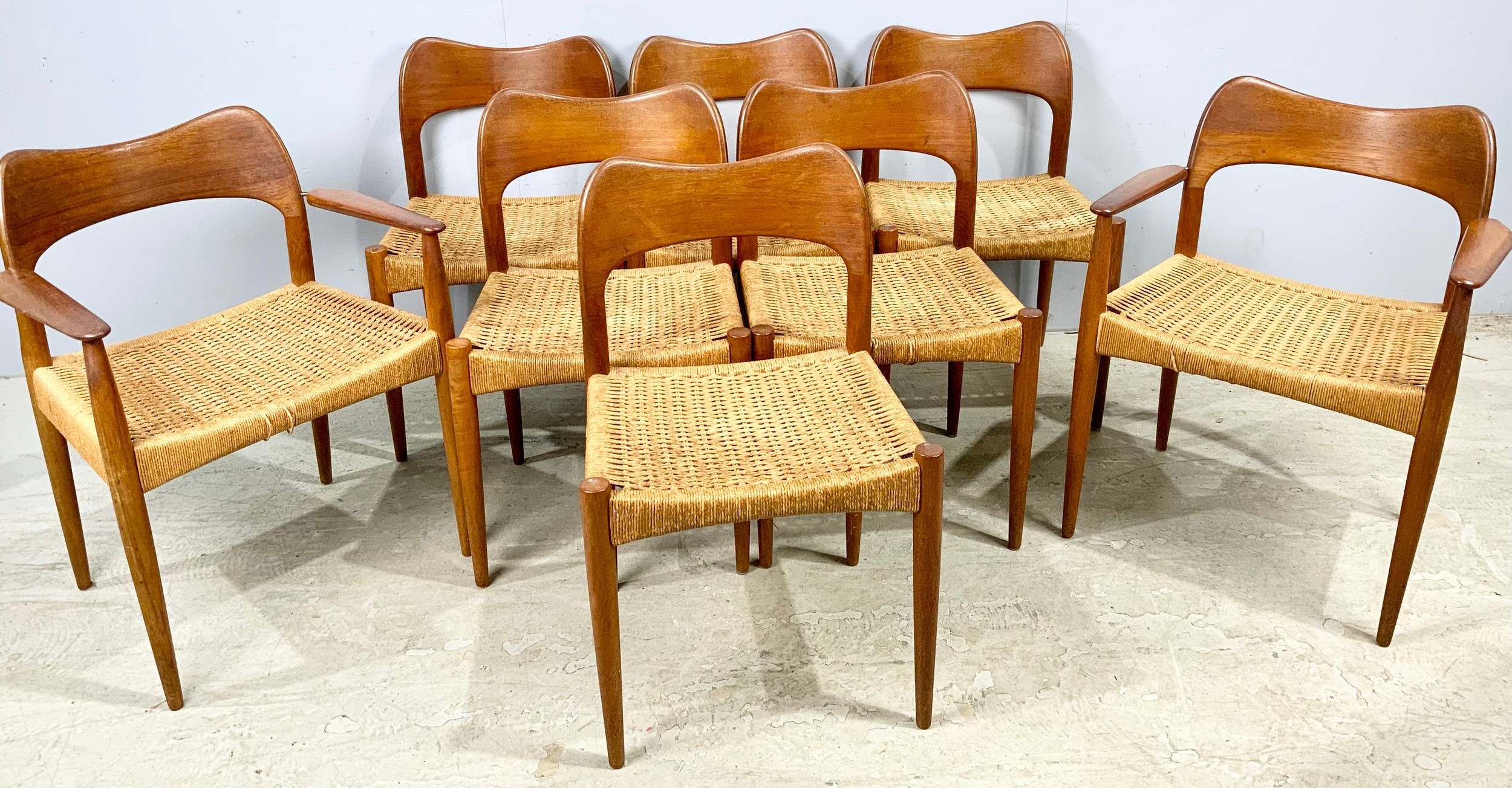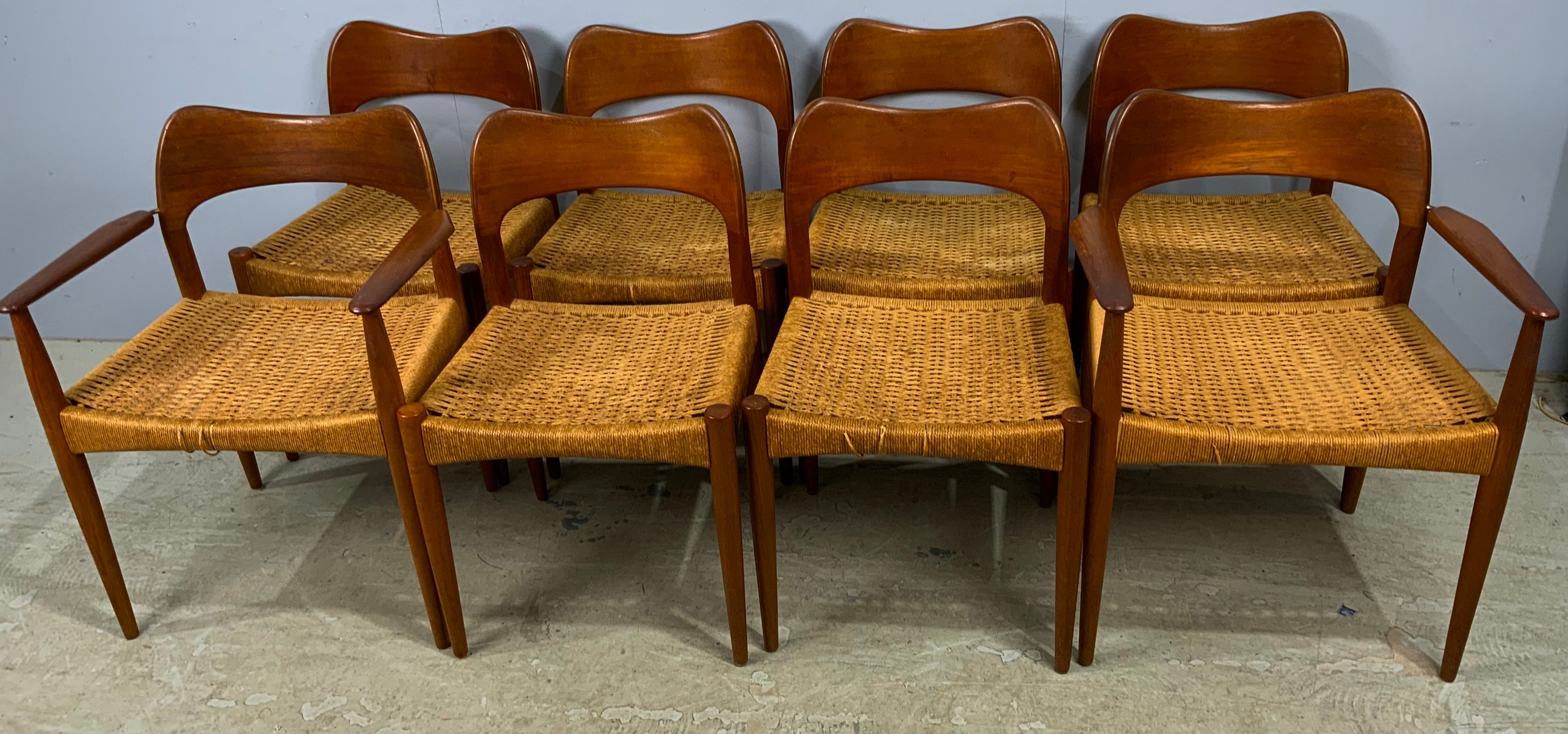SET OF 8 (6 PLUS 2 CARVERS) DANISH 1960’S TEAK DINING CHAIRS WITH PAPER CORD SEATS